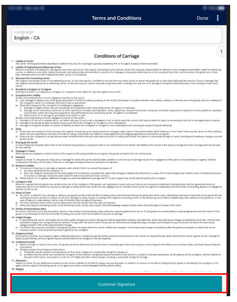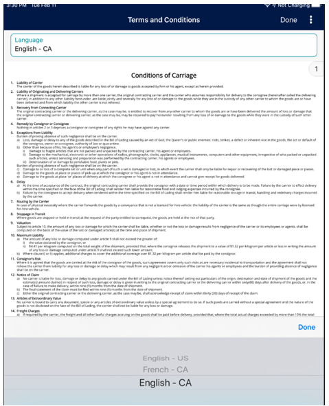 4. You will be able to see the language of the Conditions of Carriage form. You have the ability to pick between Canadian English (English – CA) and French Canadian (French – CA). To change the language of the form, tap the “Language” button at the top of the screen, then select your language at the bottom. When finished, tap “Done”.